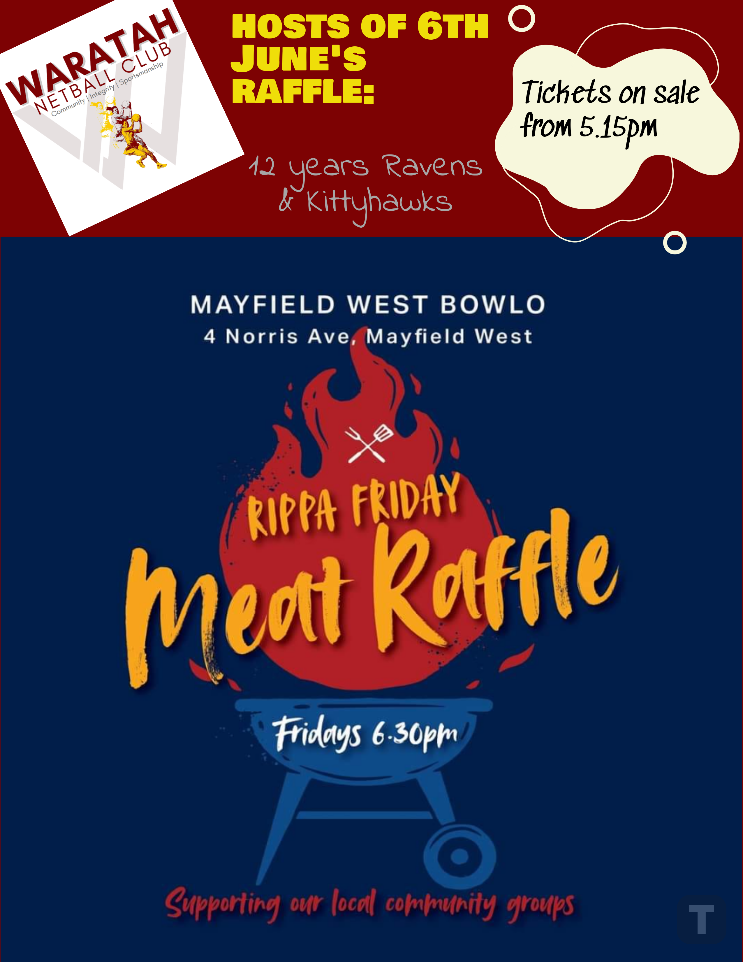 | Description: | Join us for our monthly raffles at May West Bowlo, this month hosted by our 12 years Ravens and Kittyhawks! The funds raised from ticket sales goes directly back to Waratah, which reduces our fundraising requirements throughout the year. Come along and support us, be in the chance to win some great prizes, and have some dinner and drinks whilst you are there socialising!