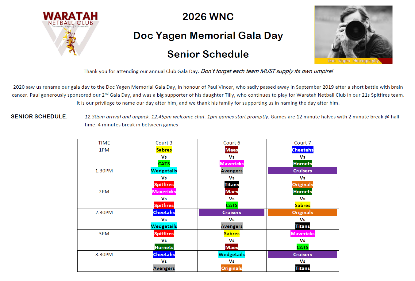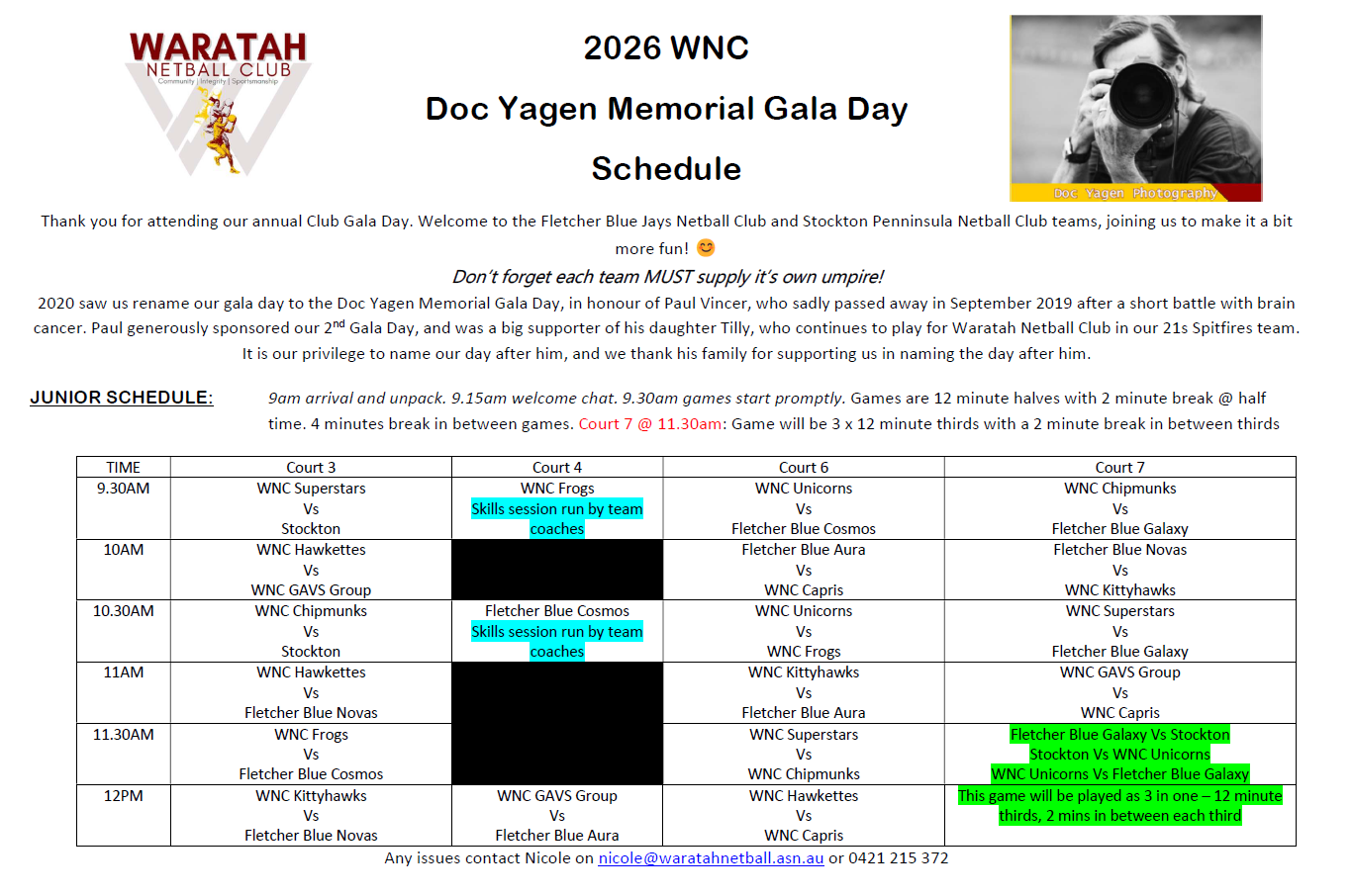 Our annual Doc Yagen Memorial Gala Day will be held for Waratah Netball Club on Saturday 21st March 2026. This is a chance for teams to get together and have some court time against other teams within the Club and any invitational teams attending. Whilst full Club uniform does not have to be worn, uniformity amongst each team for ease of identification is requested. Each team is to supply a competent umpire, or someone to coach the umpire during game play. Whilst this is a friendly and fun day, inexperienced umpires are not to be left on their own.